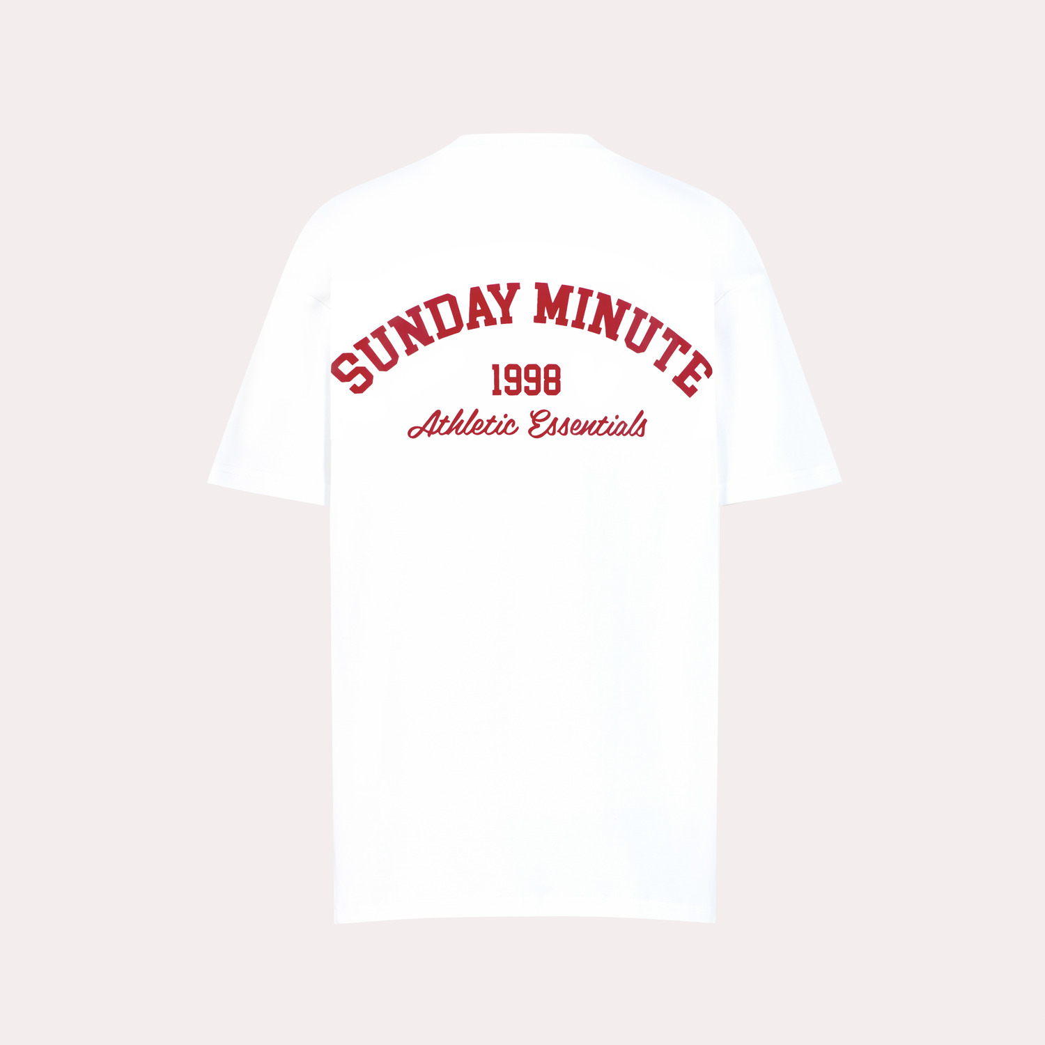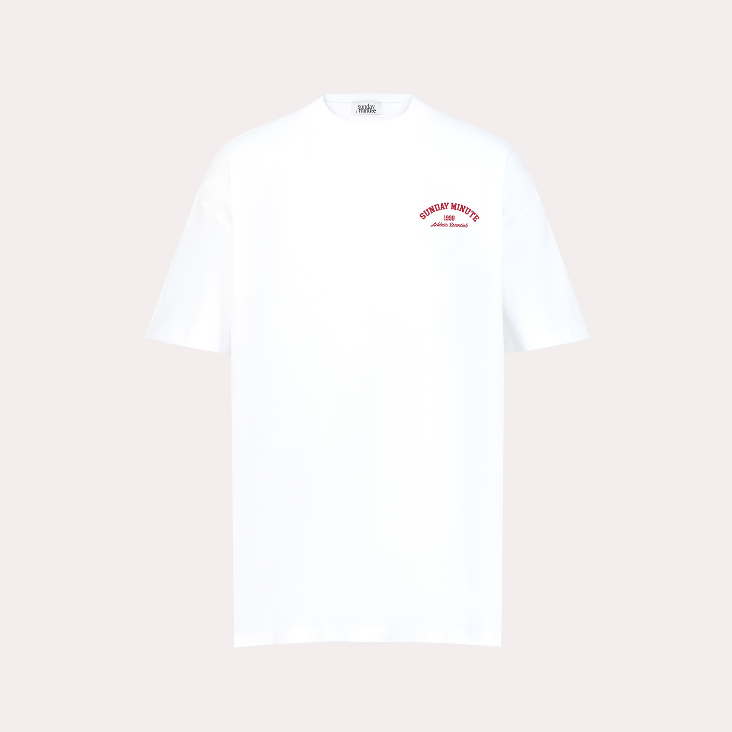 A relaxed, oversized white cotton tee featuring bold Sunday Minute prints front and back. Comfortable, breathable, and made for everyday wear.